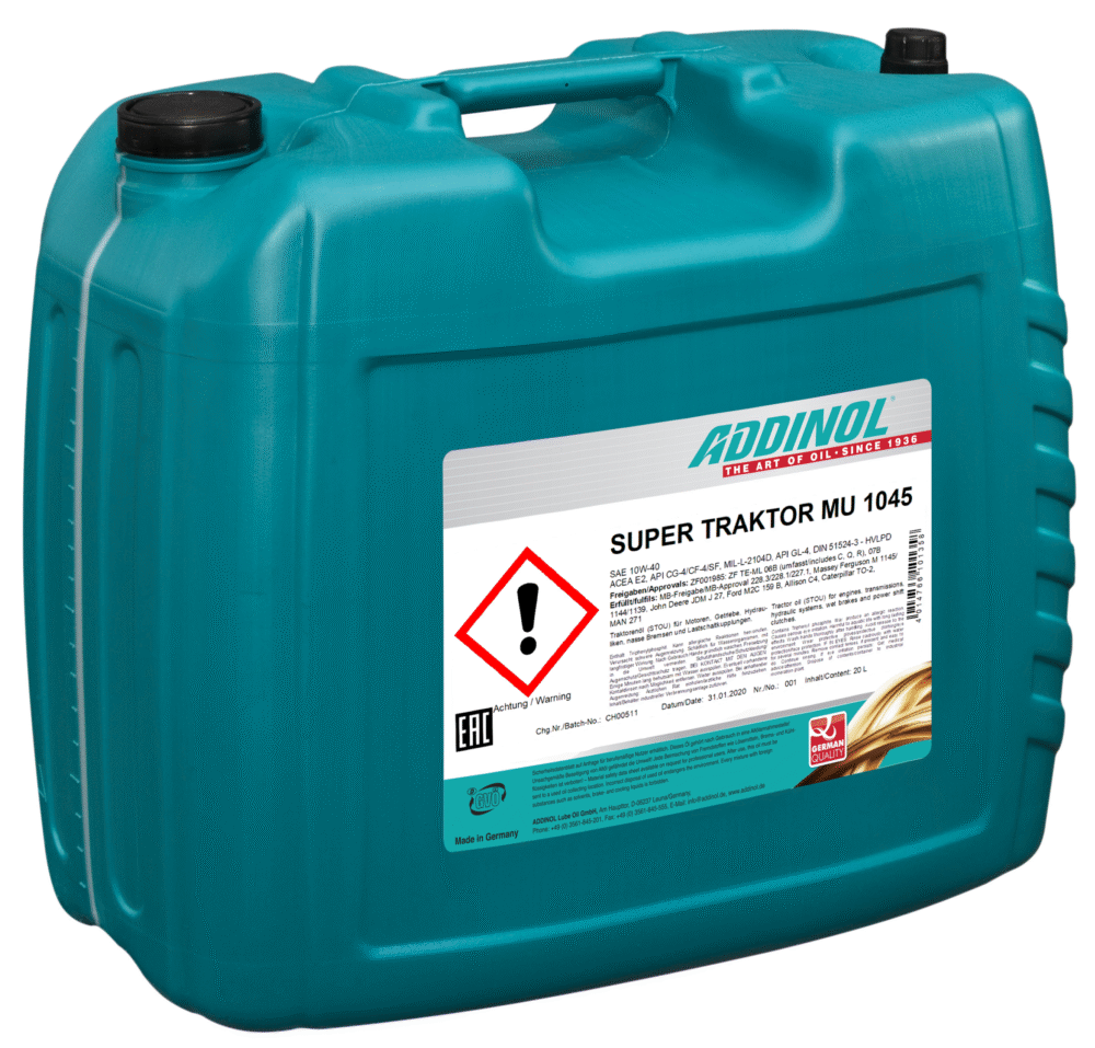 Traktoriõli Super Traktor MU 1045 kuulub SAE 10W-40 klassi. Poolsünteetiline traktoriõli ADDINOL Super Traktor MU on STOU (Super Tractor Oil Universal) tüüpi universaalne õli kasutamiseks põllu- ja metsatehnikas.